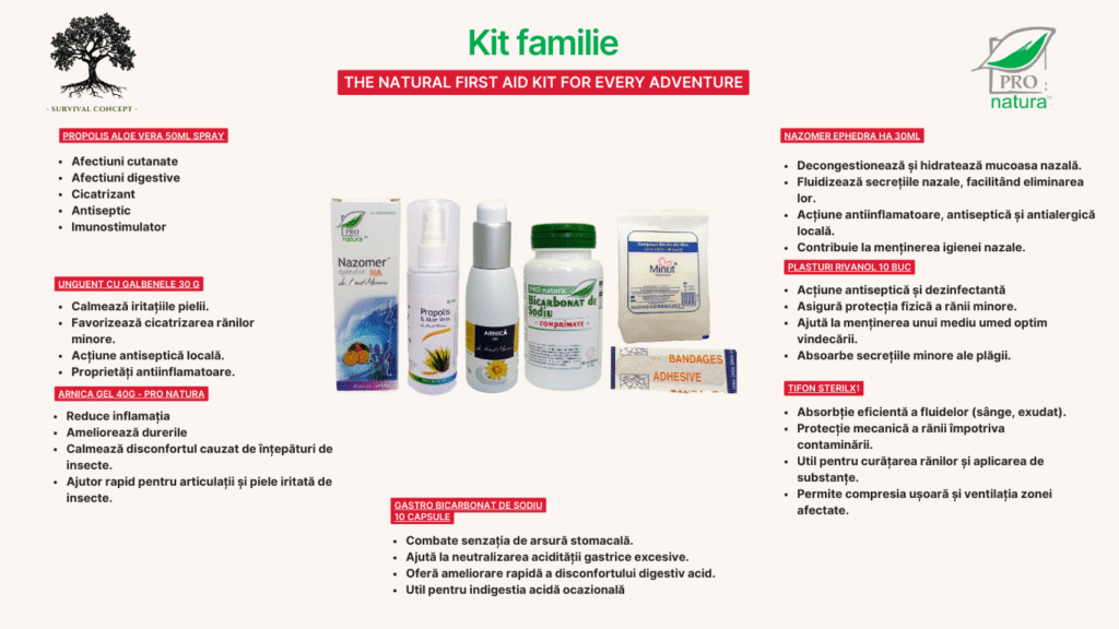 Această trusă naturală de prim ajutor este special concepută pentru a oferi soluții eficientebazate pe ingrediente naturale și extracte din plante, pentru gestionarea rapidă și sigură a micilor accidente, iritații, dureri sau disconforturi digestive, în cadrul întregii familii. Este potrivită atât pentru acasă, cât și pentru călătorii sau activități în aer liber.